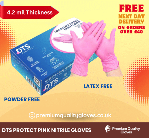 DTS Pink Premium Quality: A premium quality Pink Nitrile examination glove designed to provide the highest level of performance and protection you need to get the job done. Chemical and puncture resistant, known for strength, dexterity and comfort. These gloves are great for a range of purposes due to their versatility, durability and sensitivity.